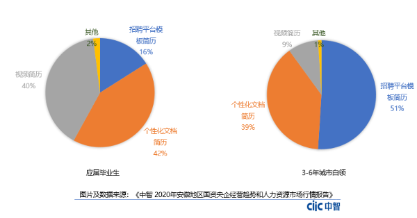 數(shù)據(jù)顯示,42%的2020應屆生求職會選擇個性化的文檔簡歷呈現(xiàn)給HR,40%的應屆生求職選擇視頻簡歷更直接的展示自己的優(yōu)勢。相比之下,較傳統(tǒng)的招聘平臺模板簡歷,只有16%的應屆生求職時選擇使用。另一項數(shù)據(jù)顯示,3-6年的城市白領求職者簡歷呈現(xiàn)方式選擇傳統(tǒng)的招聘平臺模板簡歷,選擇視頻簡歷呈現(xiàn)的比例僅為9%。